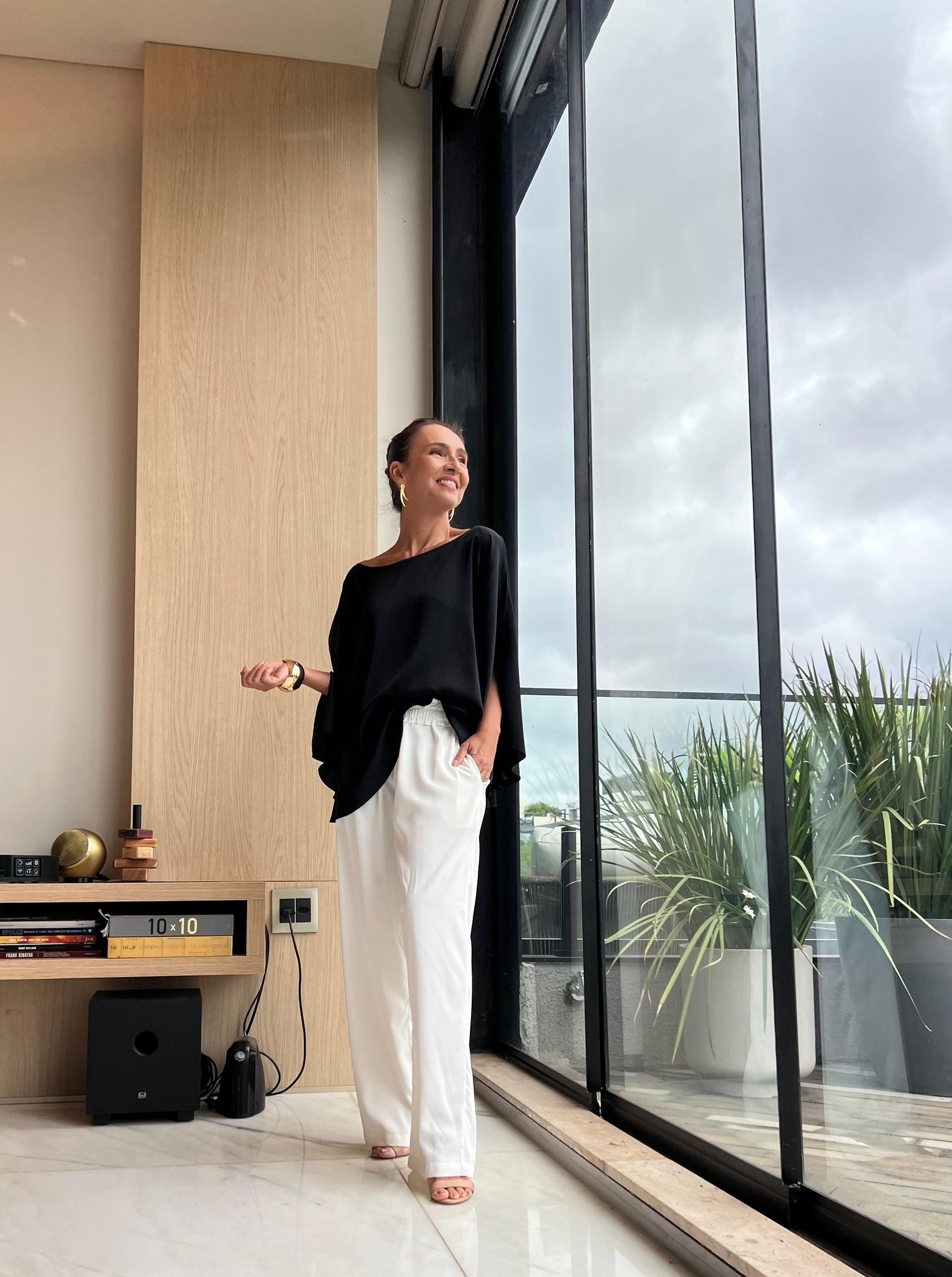Blusa em shape solto, abertura para os braços, decote reto, mangas amplas e soltas. Pode ser usada com calças e saias.