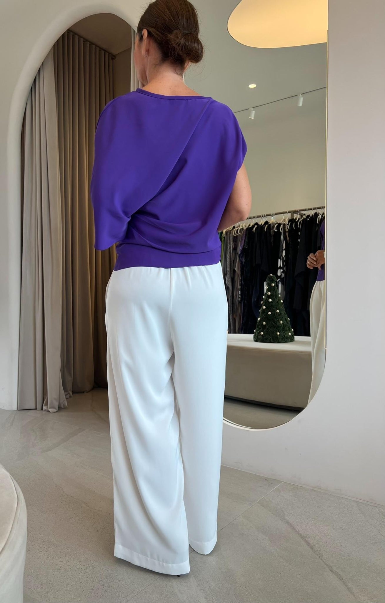 Blusa em shape solto, drapeada, assimétrica e com mangas médias.