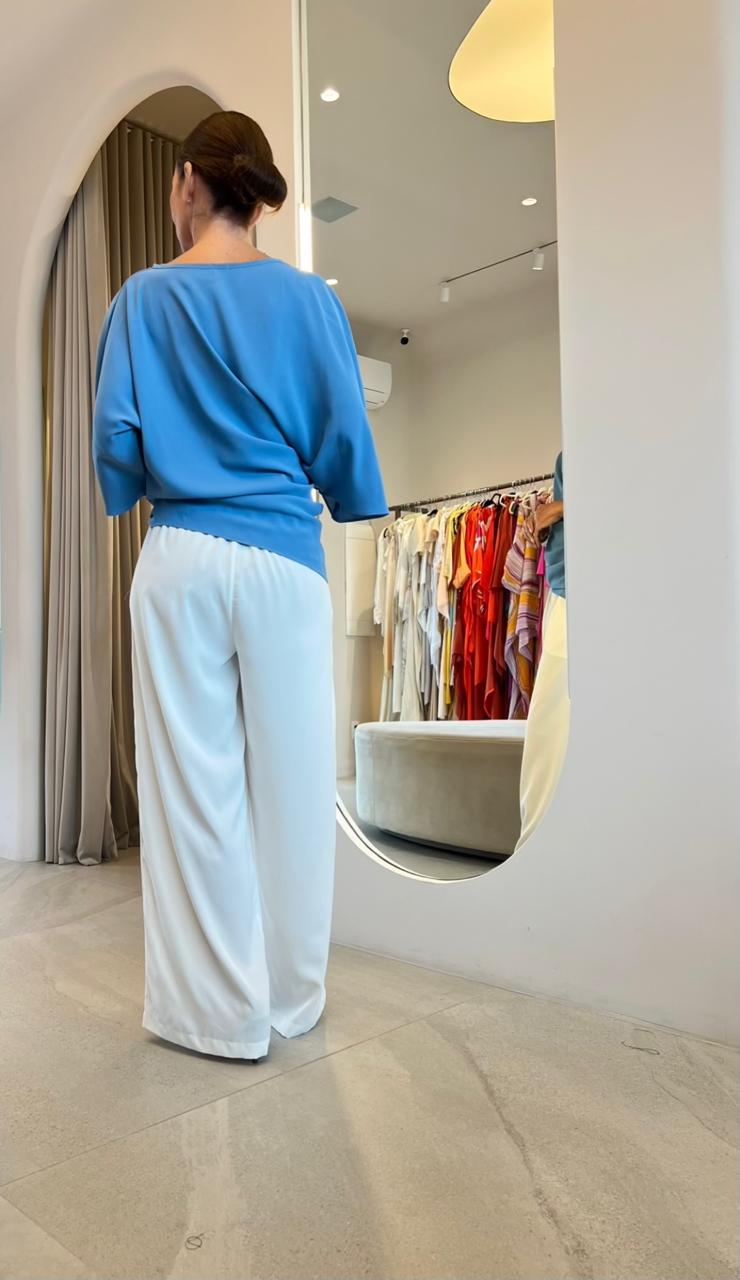 Blusa em shape solto, drapeada, assimétrica e com mangas médias.