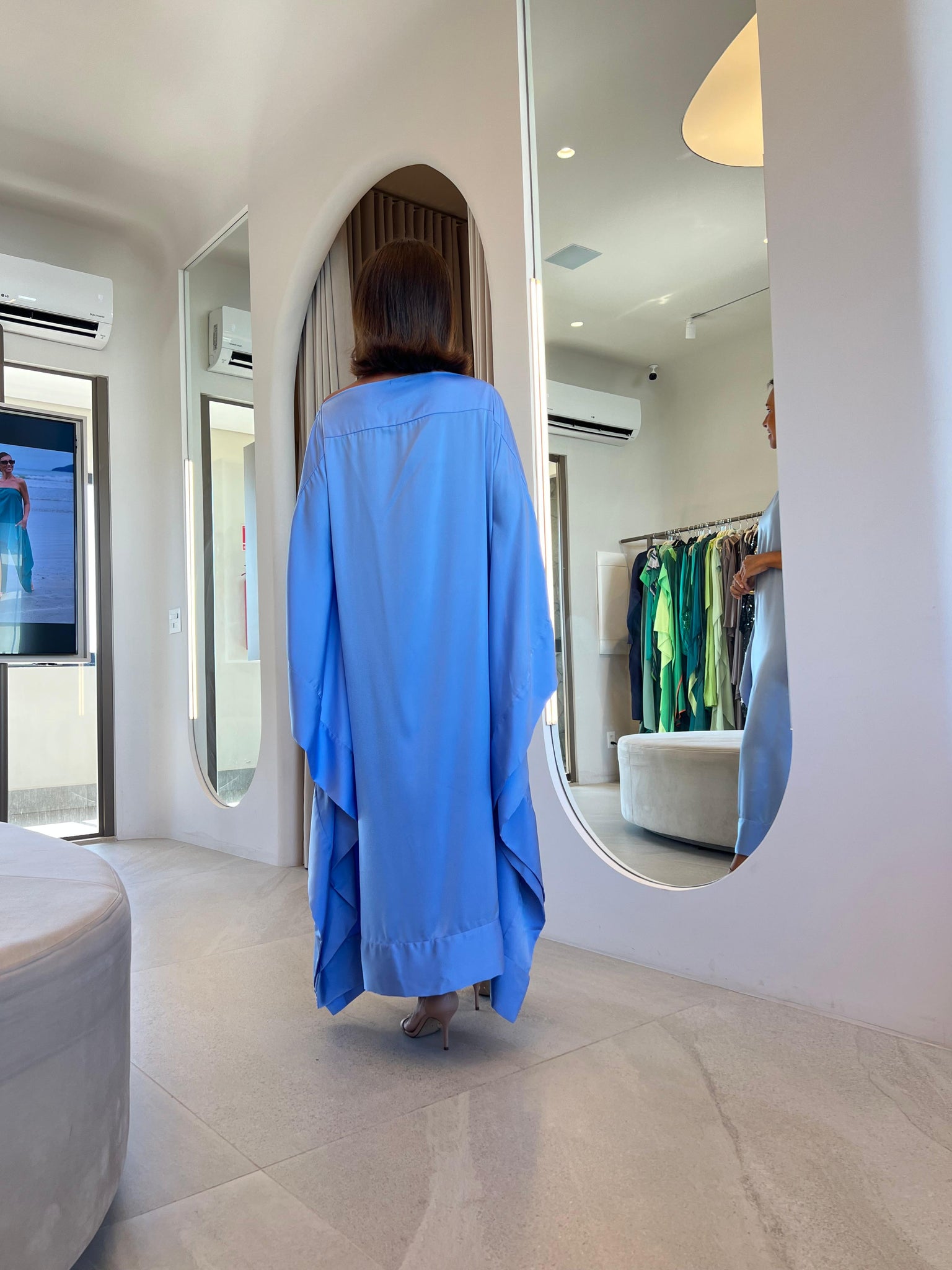 Decote reto, fendas laterais, mangas com duas aberturas em sua extensão que permitem usar a peça sem mangas, com mangas 3/4 ou longas. Design das mangas acompanha a extensão long midi do kaftan criando ondas de movimento.