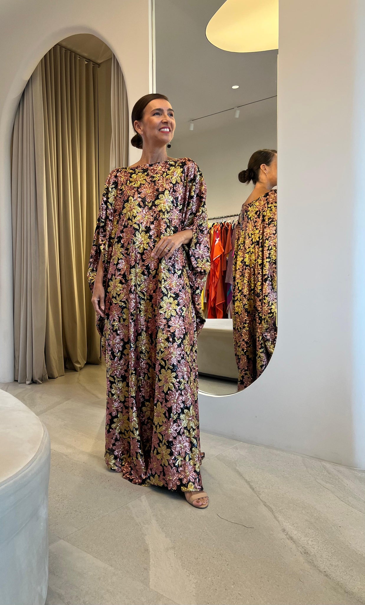Kaftan bordado em paetês e desenhos de flores.