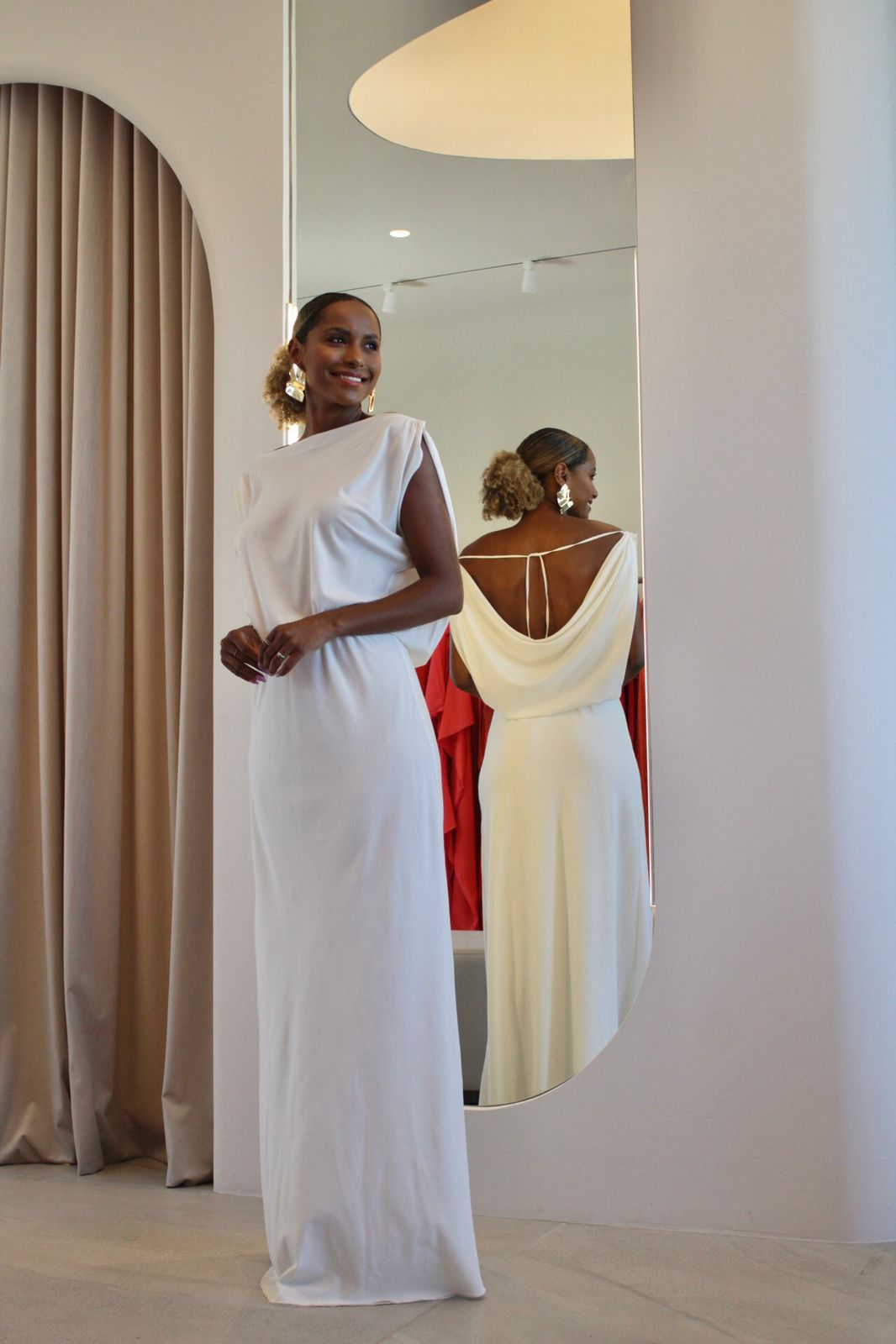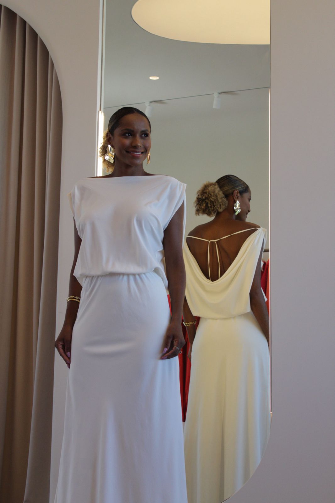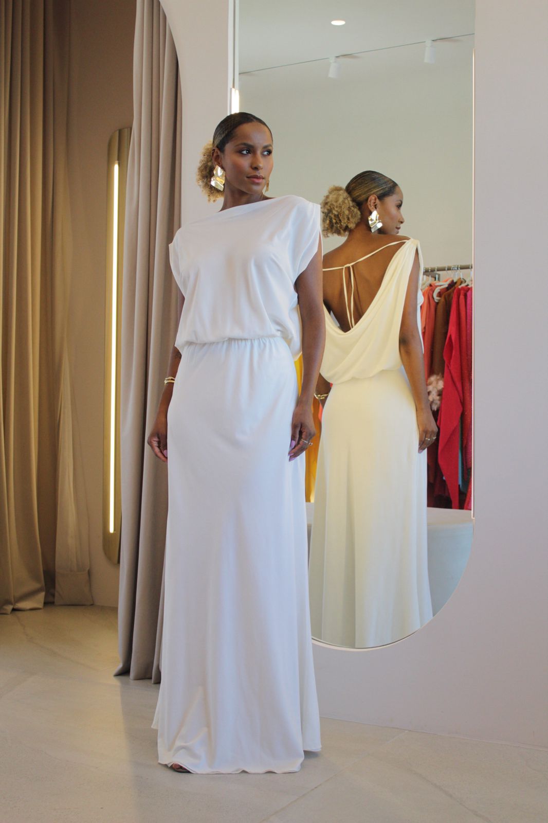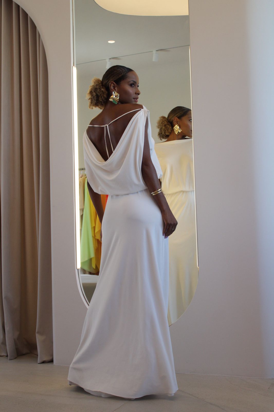 Vestido em decote degagê, com rolitê para o conforto do decote das costas. Modelo acinturado com elástico, comprimento longo e sem fendas em movimento leve e fluido! Modelo duplo de tecido, sem transparência.
