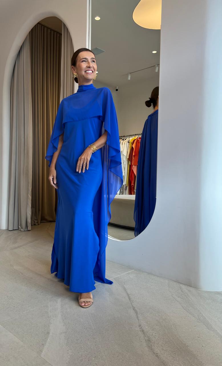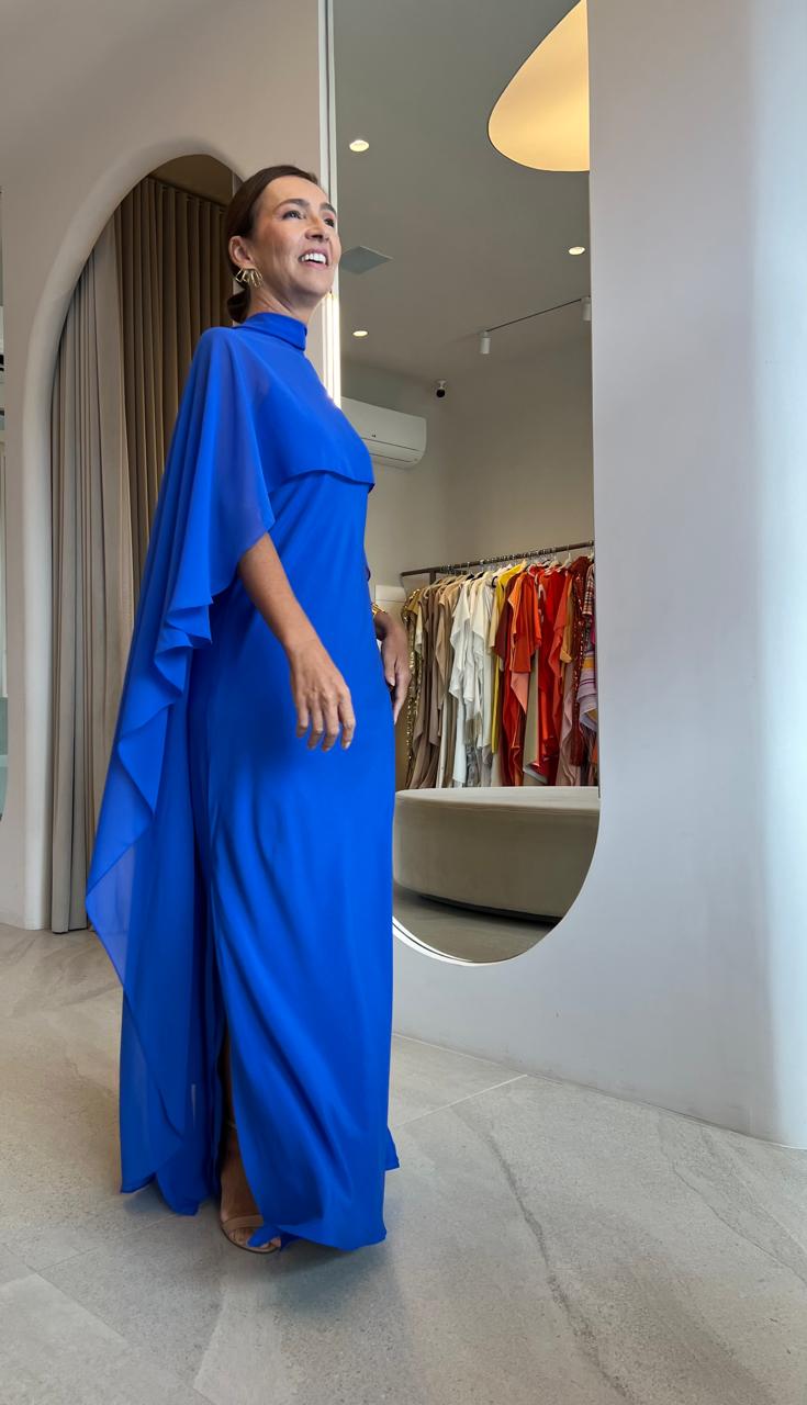 Slip Dress no Dux e capa assimétrica na musseline, gola alta, amarração na parte de trás e possibilidade de usar com ou sem ela. Leve, esvoaçante e alonga o corpo.