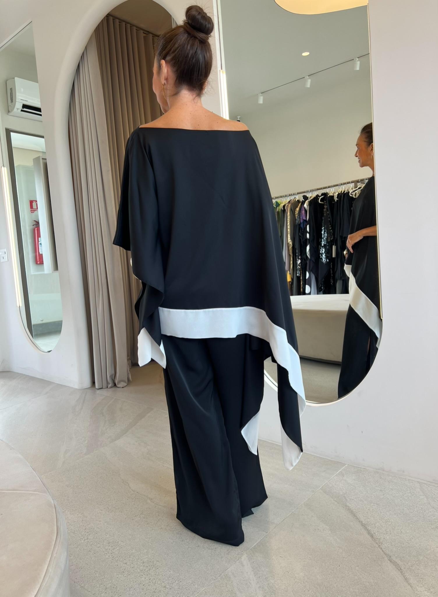 Blusa em shape solto, abertura para os braços, decote reto, mangas amplas e assimétricas. Barrado na Musseline. A calça é a nossa queridinha Juliana - fendas laterais e elástico na cintura!