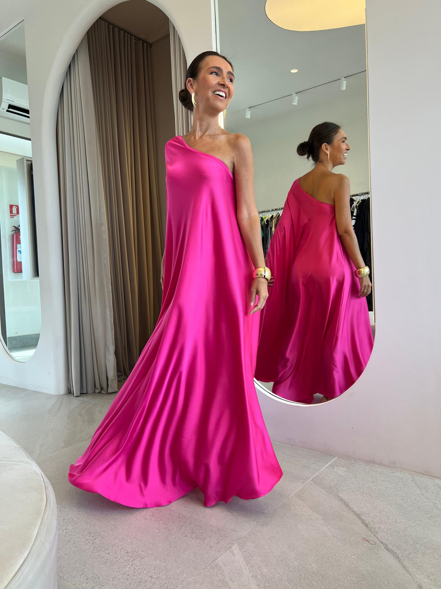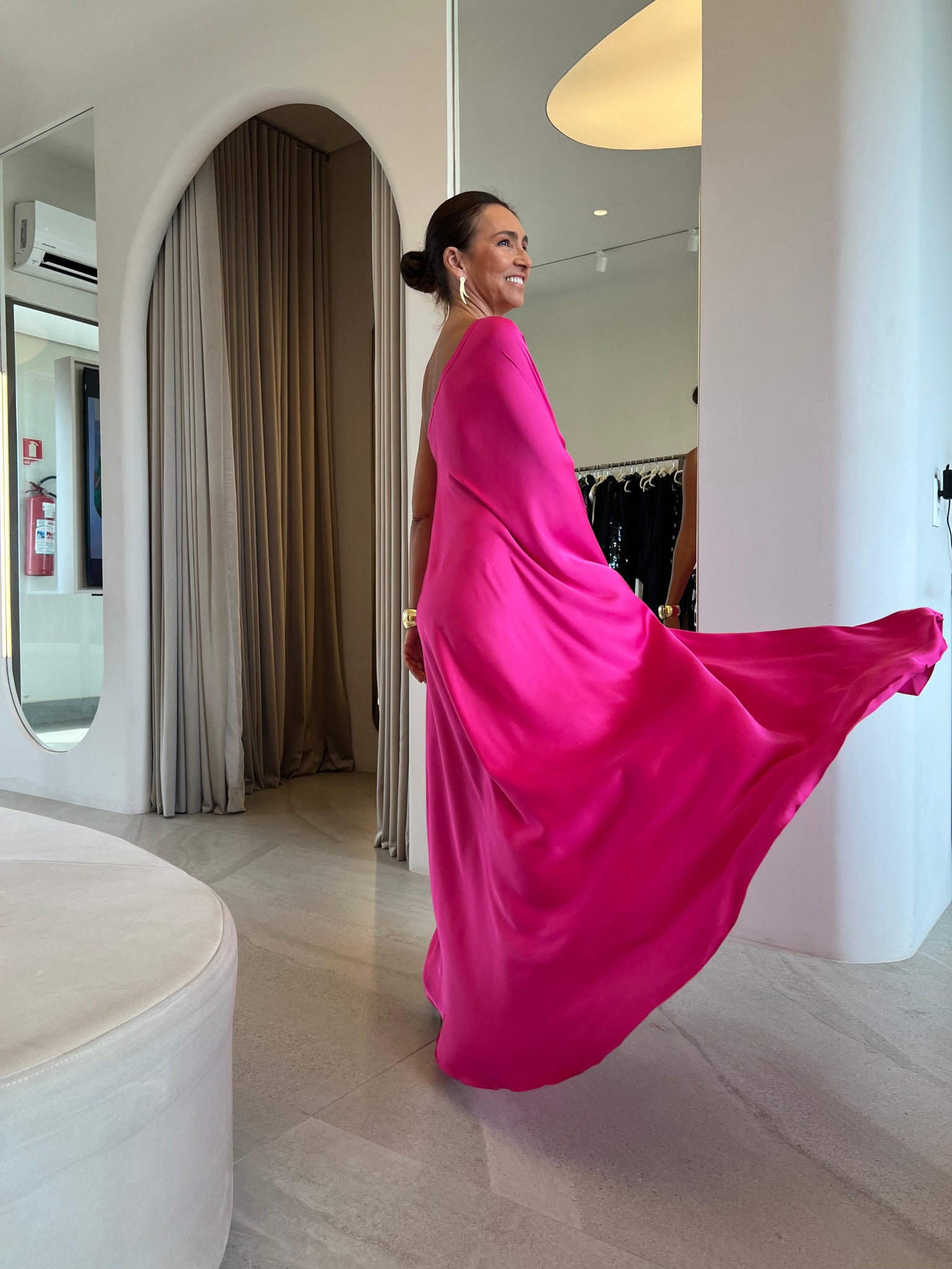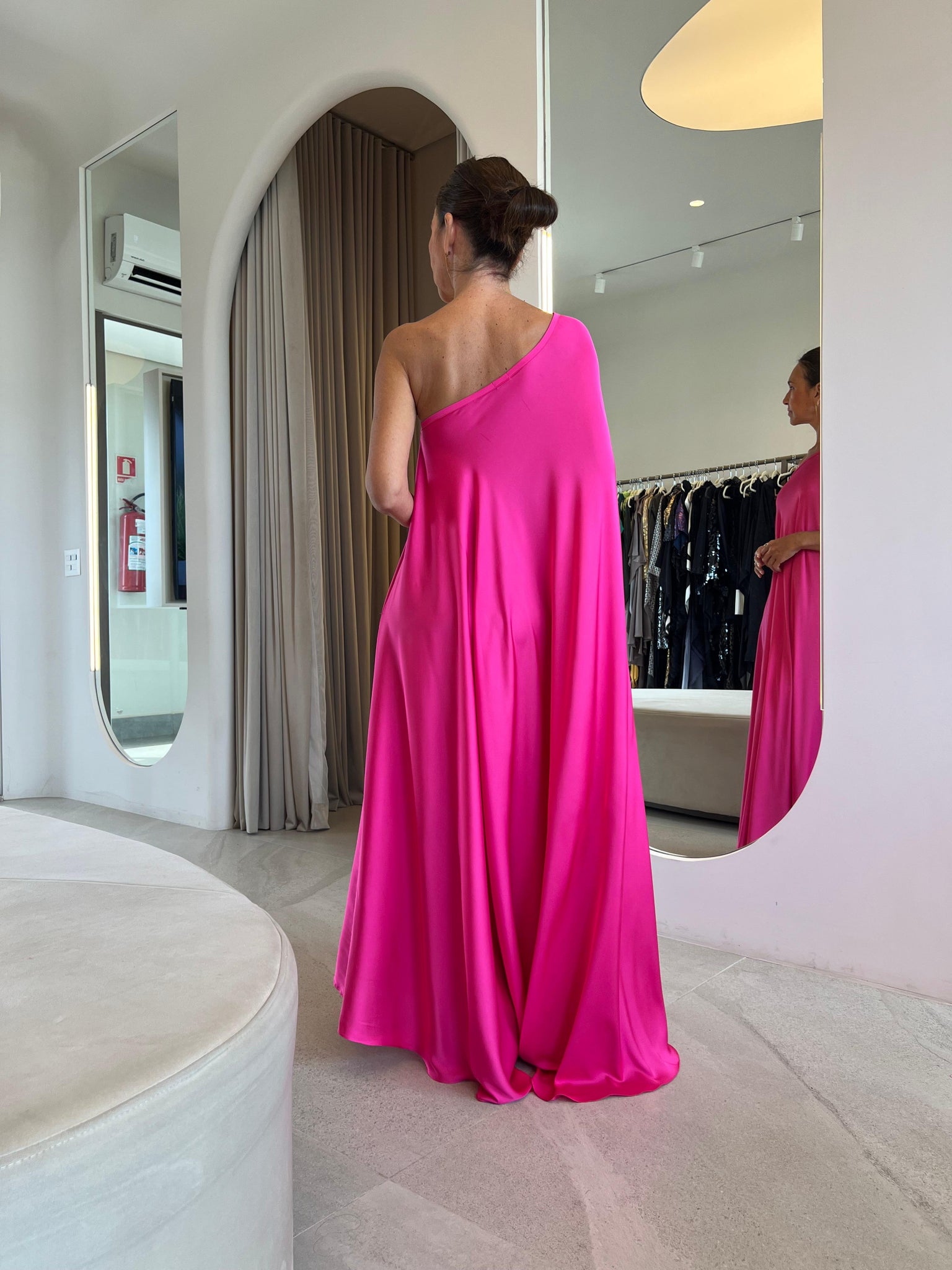 Kaftan em modelagem nula manga, barrado em assimétrico que assina o movimento da peça em tecido de brilho acetinado! Bem fluido!