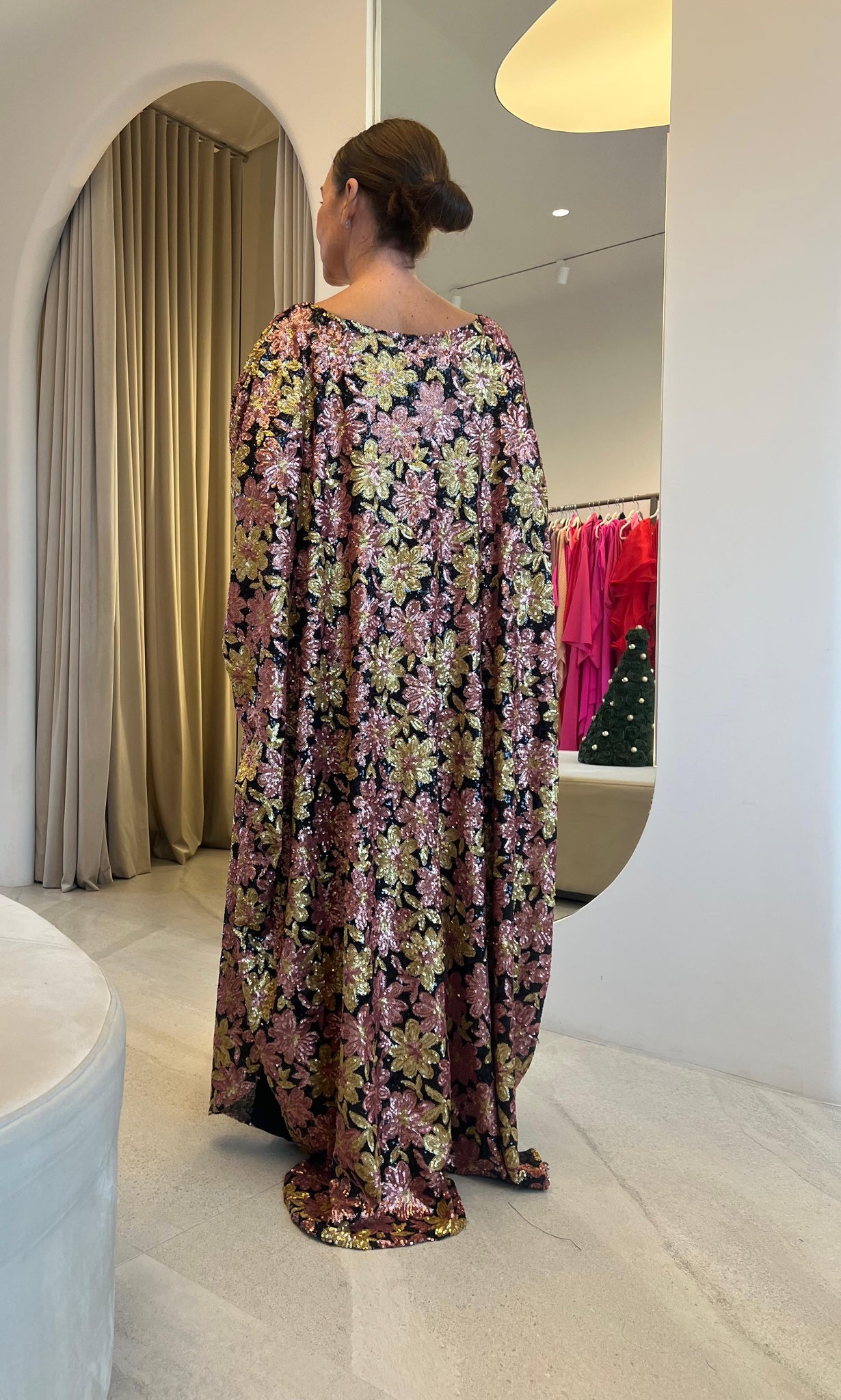 Kaftan bordado em paetês e desenhos de flores.