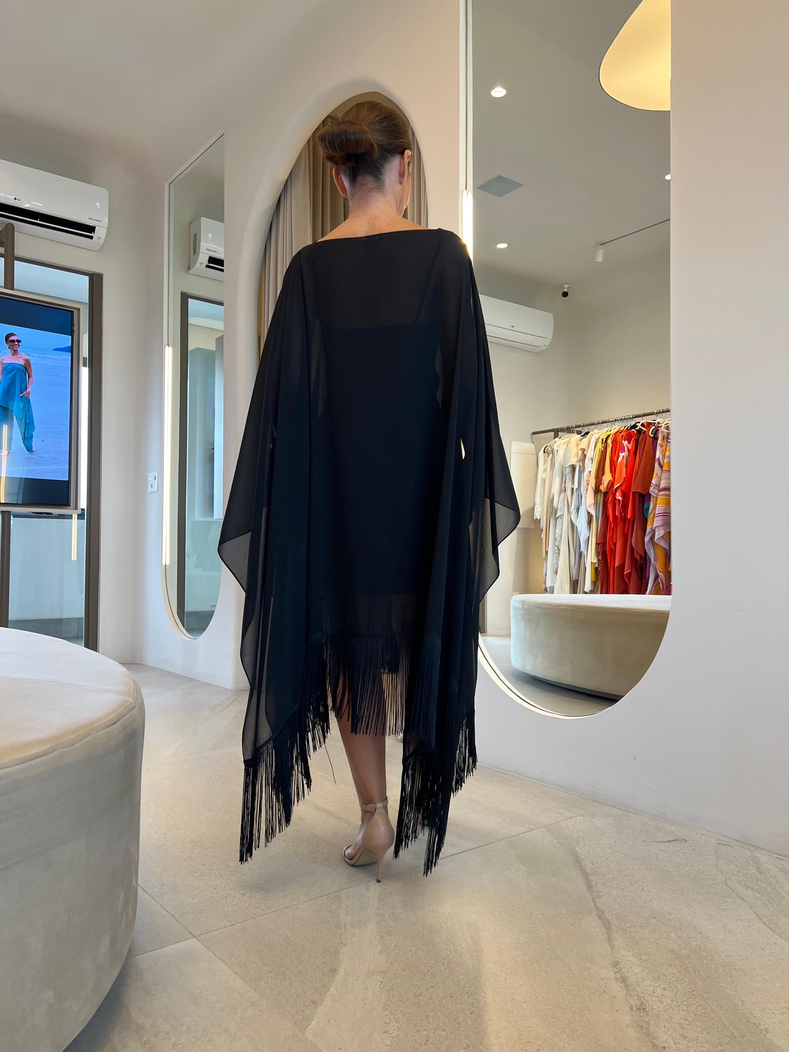 Kaftan with boat neckline, sleeves with two openings in its extension that allow to wear the piece without sleeves, half sleeves or long sleeves. The rounded hem creates waves of movement throughout the length of the piece.