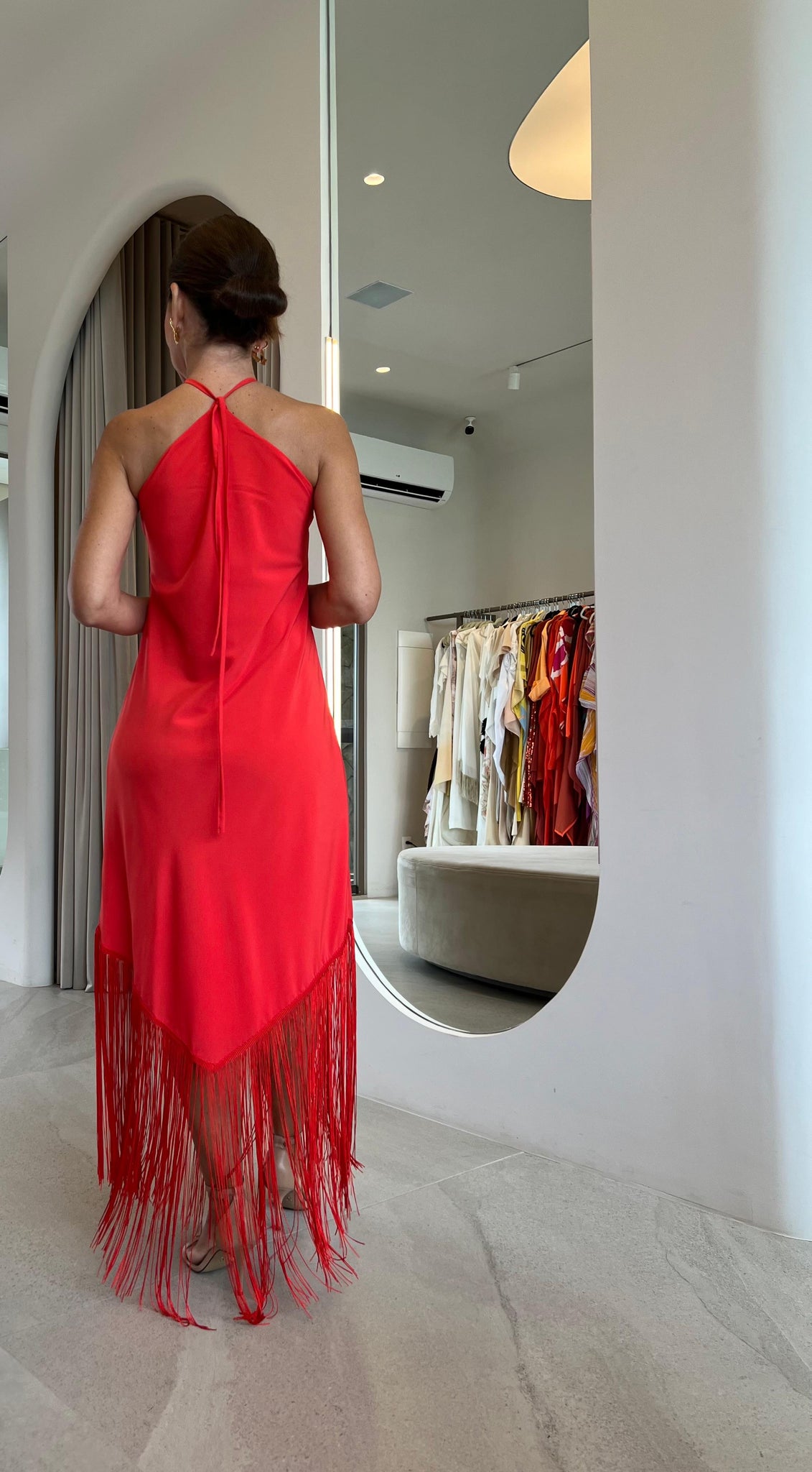 Kaftan em decote V na frente, sem mangas e decote V nas costas. As franjas são responsáveis por dar um movimento incrível a peça! As pontas também são em formato V. Atitude e muita elegância!